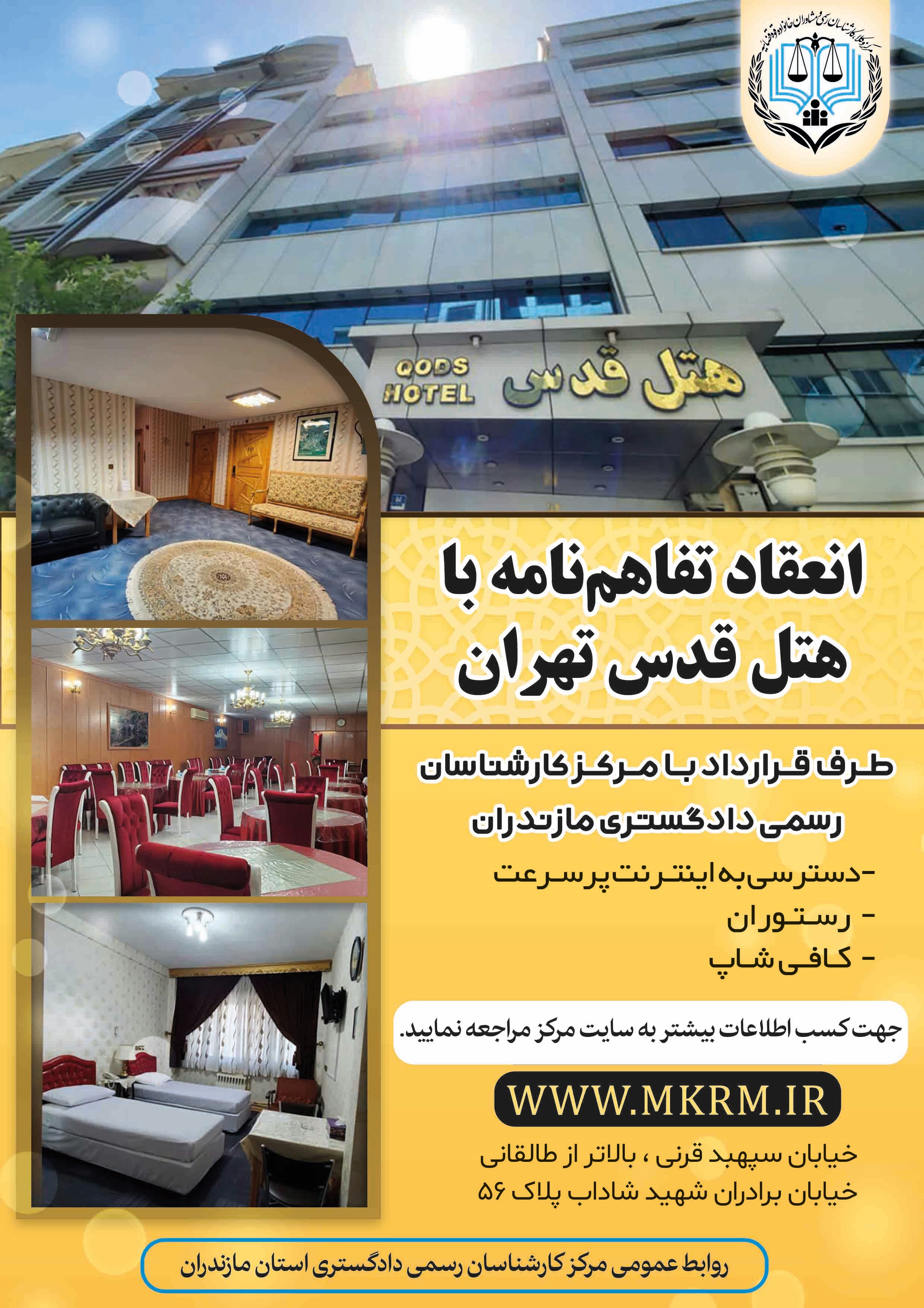 مرکز کارشناسان رسمی دادگستری استان مازندران در راستای ارتقای سطح رفاه و تسهیل خدمات برای همکاران خود، تفاهمنامهای با هتل قدس در استان تهران به امضا رساند.